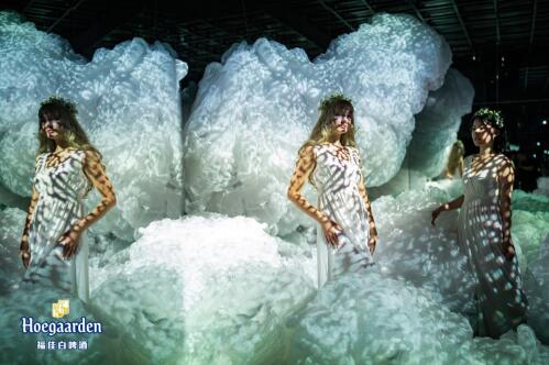 艺术家何为的作品《云端漫步》,灵感源自福佳白啤酒“自然云柔,清香绵密”的饮用体验。融合装置、声音、编程等数字影像,打造了一座沉浸式的夏日云端剧场。巨大的云朵装置和虚拟影像的组合,福佳白啤酒文化和艺术精神以作品为介质展开了一段浪漫欢愉的对话。