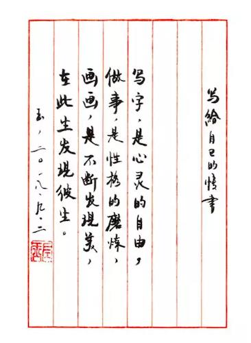 左玉:伴侣关系。拿起了笔,我仿佛和知音在一起。它知道我内心的声音。从中得到更丰富的美的感受,更大的精神鼓舞,和更多发自内心的表达。