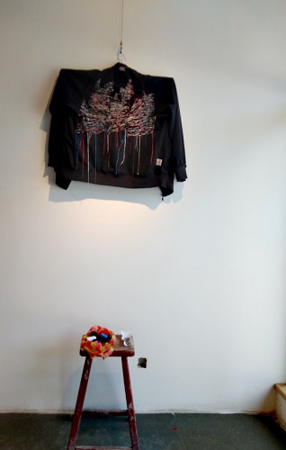 在自己穿过的衣物上,用中国女性传统的针线表现现场。地域空间随时可变。针刺的对象物是有隐喻性的物像或是文化的,历史和自然的场所,具有场所精神的呈现。针的刺疼感,线色彩,走向的连接与借用,都具有有指向性,物像 心像与场所 三者建立了特定的关系。