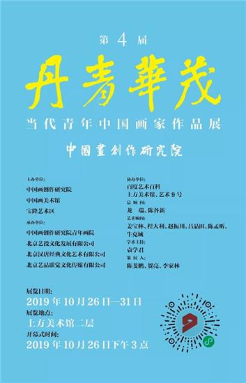 为进一步推动当代中国画的发展,发掘推介并宣传新时代青年中国画家的学术成果,由中国画创作研究院、中国画美术馆、宝隆艺术区联合主办,中国画创作研究院青年画院、北京艺投文化、北京汉唐经典文化、北京艺品联觉文化联合承办,百度艺术百科、艺术9号、上方美术馆联合协办的“第四届丹青华茂——当代青年中国画家作品展”于2019年10月26日下午在上方美术馆隆重开幕。