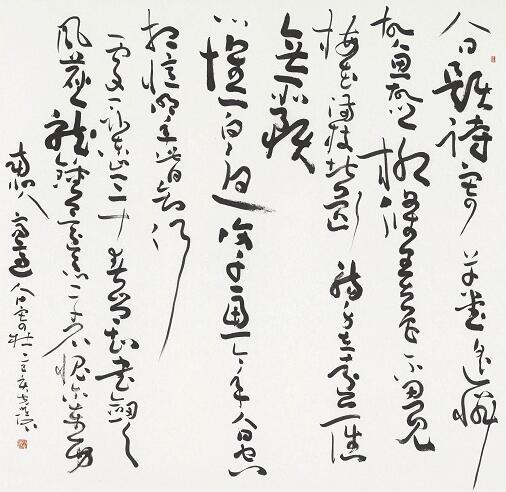 1 (9) (LR)材料:水墨宣紙。年代:2019年。尺寸:124x127cm。釋文:人日題詩寄草堂,遙憐故人思故鄉。柳條弄色不忍見,梅花滿枝空斷腸。身在遠藩無所預,心懷百憂複千慮。今年人日空相憶,明年人日知何處。一臥東山三十春,豈知書劍老風塵。龍鐘還忝二千石,愧尔東西南北人。鈐印:允恭寇克讓璽。