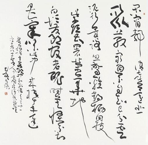 1 (10) (LR)材料:水墨宣紙。年代:2019年。尺寸:124x127cm。釋文:閑宵靜語喜還悲,聚散窮通不自知。已分云泥行異路,忽驚雞鶴宿同枝。紫垣曹署榮華地,白髮郎官老醜時。莫怪不如君氣味,此中來校十年遲。鈐印:允恭寇克讓璽。