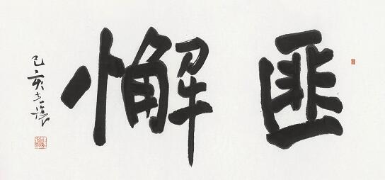 05-2.材料:水墨宣纸。尺寸:48X120cm。年代2019年。释文:匪懈。己亥克讓。鈐印:允恭,寇氏。