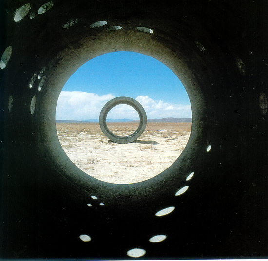 1973年一位叫南希·霍尔特的女艺术家开始在美国犹他州的沙漠摆放四只巨大的水泥隧道,每一只长549cm,内部的直径为244cm。为了完成这次摆放,花了她四年的时间,到1976年才得以完成这件名为《太阳隧道》的作品。为了寻找一个合适的地点,南希花了不少时间,她希望这是一个开阔的地方,尽量要荒凉一些,这样就不会因公共用地而无法把四只水泥隧道保存下去,当然,还要不能距离交通线路太远。还好,她最后找到的一个地方完全符合这些要求。南希原来是位摄影家,她对光影的变化有特殊的敏感,在她的眼里,这四只隧道就如同巨大的镜头,她希望从每个端口望过去,可以产生特殊的光照效果。冬至、春分、夏至、秋分时,太阳的升起和降落都有特殊的角度,南希就把四只隧道按照这四种角度排列,这样,每到新的季节来临那天,就有一只隧道口正好对着日出和日落。当每个特殊的日子到来的时候,透过相应的洞口,灿烂的光芒会染红整个隧道,而其他几只则呈现不同比例的光影关系。