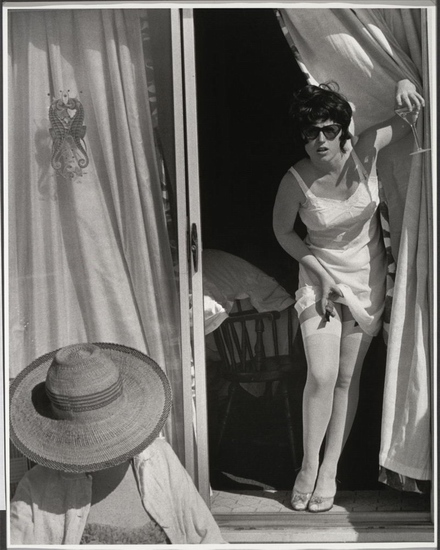 在照片中,那些女人常常是呆在一个相对内部、相对私人的空间里,比如书房、卧室、客厅等。在这些原本该感到很放松、很自由的环境下,那些女主人公却流露出一副紧张、无助、迷茫的神情,就像有人正在窥探她们一样,还摆出了一些性感、魅惑、优雅的姿势,如同在拍摄广告宣传片、电影。比如,在这张照片中,女主人在自己家中,却还带着墨镜、穿着连裤袜、白色礼服吊带裙,一副时尚摩登的装束,像是要准备出去逛街。不仅如此,她一手拿着高脚杯,依靠在门框边;一手拿着香烟,边撩起裙摆,露出了大腿的根部;她表情魅惑、挑逗,就如同在摆拍广告一般。